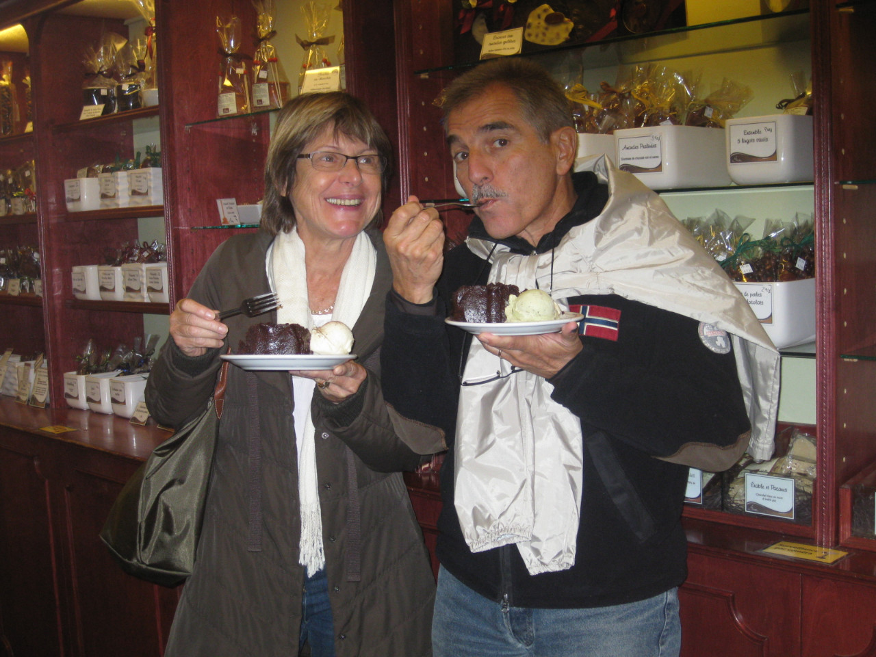 Jean-Mi, adorateur du Dieu "Chocolat Chaud", aime se "sucrer le bec", comme ici avec Christine. Il est particulièrement servi au Québec..et nous relatera son palmarès des meilleurs breuvages sous peu !